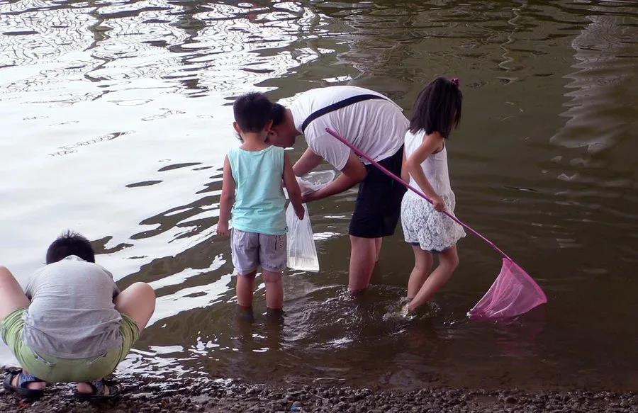 小孩子們每人拿個(gè)漁網(wǎng),興奮的在河里撈來撈去,但如今的小河已不似我們小時(shí)候常常玩的那條小河了,河水少了,魚兒也很少了,只能看到一些小蝌蚪,所以一下午的成果就是撈了幾條小魚和一些小蝌蚪。