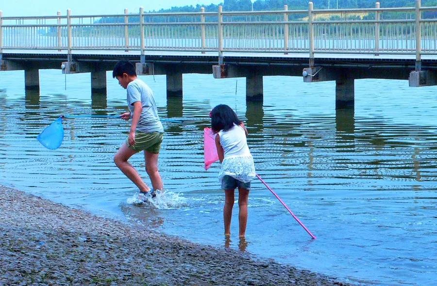盡管如此,孩子們依然興奮不已,因?yàn)楝F(xiàn)在生活在城市里的小朋友,他們的童年總是少幾分自然風(fēng)光,小朋友深深地喜歡著藍(lán)天白云小河流水,而這樣的風(fēng)光卻似乎不及我的童年那般司空見慣,那時(shí)候沒有漁網(wǎng),衣服是最(好)的圍捕工具,傍著石頭我們把衣服圍成半圓,邊上留個(gè)小口,小魚兒一條兩條……鉆進(jìn)來,我們也悄悄地收了口,然后捉魚、數(shù)魚、再捕、再數(shù),直到夜幕降臨,我們才戀戀不舍地把這些魚兒放回水中,穿著濕了的衣服回家!