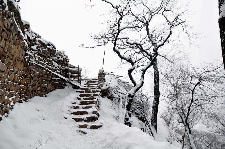 驅車從縣城出發(fā),經山泉峪過大下車便進入一段盤山公路,一路上零星幾處人家,寥寥幾縷煙火,雖說是冬季,但山間松柏依舊發(fā)翠,草木夾雜著白雪,竟也分出黃、白、綠、灰諸多顏色來。冬季由于樹葉凋零,人的視野就格外開闊了起來,愈發(fā)覺得這山的巍峨、險峻。