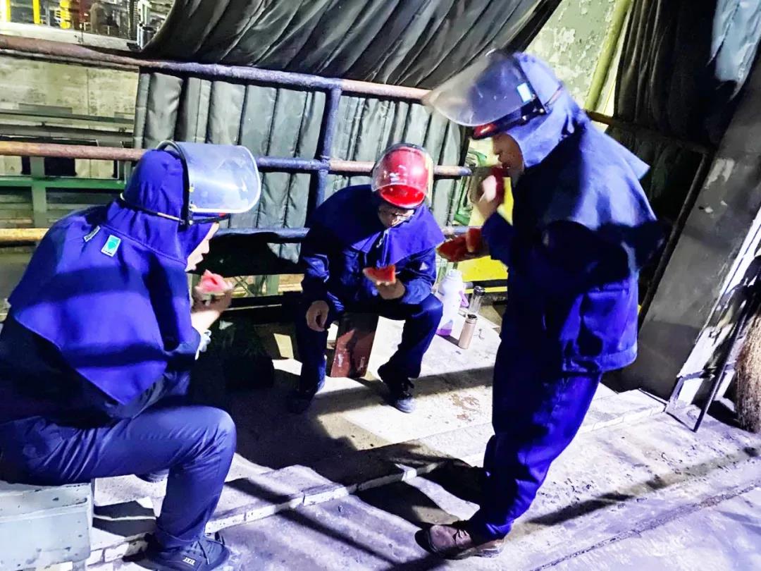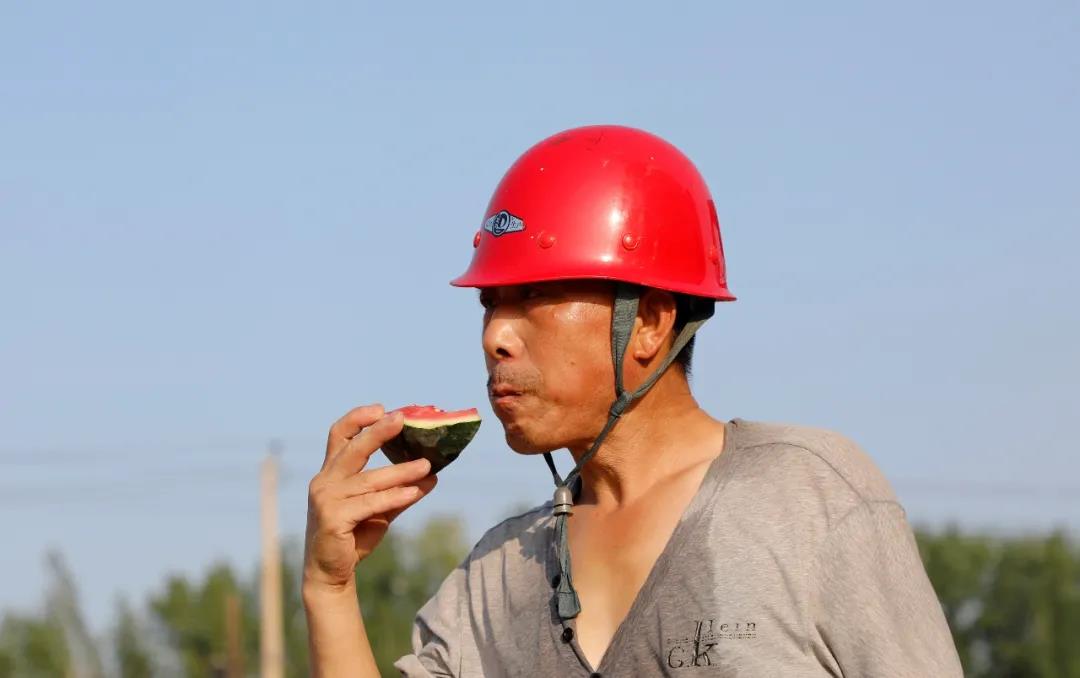 滿身大汗的工人師傅暫時停下手里的工作,吃一口清甜的西瓜,補充水分之余,也消除了一絲疲憊,增添了一份干勁。