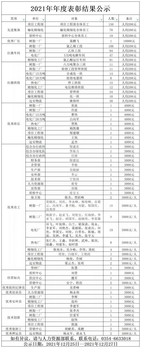 結合各單位推選出的先進個人,2021年度共計表彰先進集體3個,紅旗車間4個,紅旗班組9個,先進個人98名。
