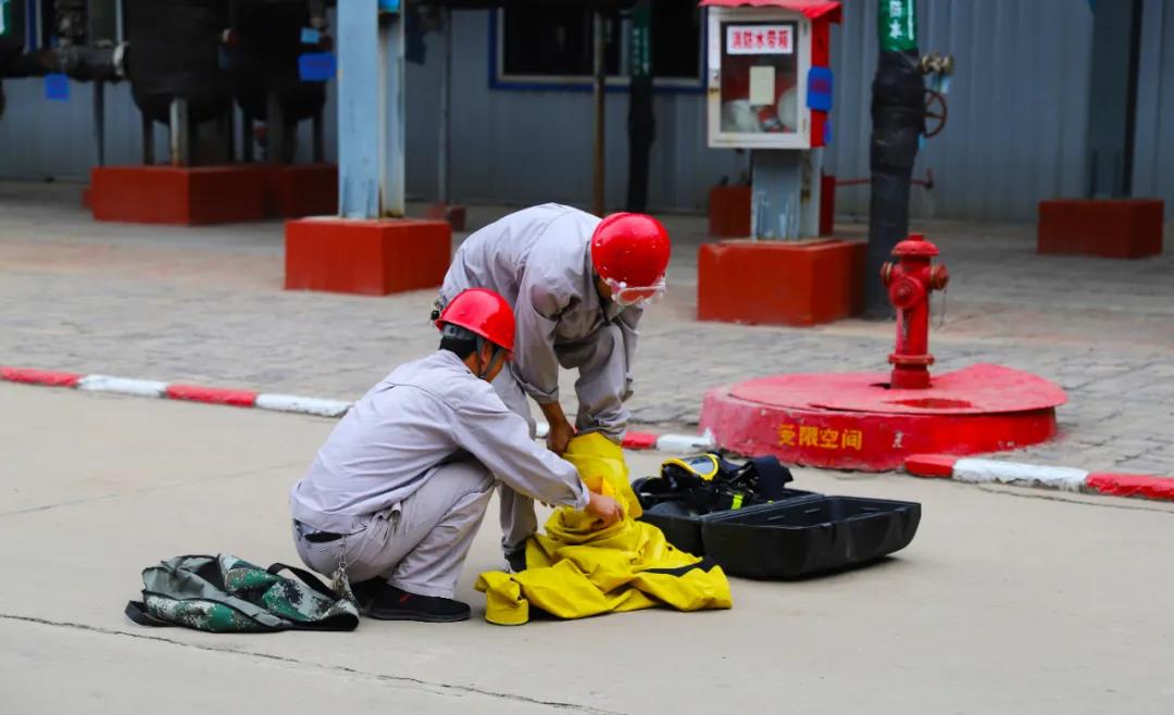 值班維修人員拿輕型防化服和空氣呼吸器到達現(xiàn)場開始穿戴